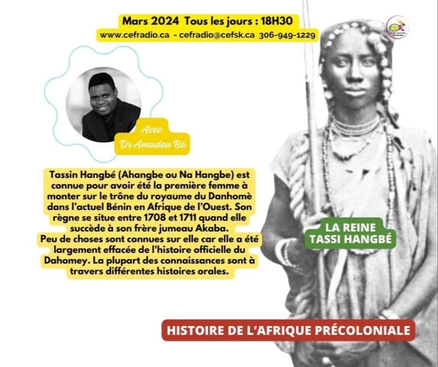 L'histoire peu connue de la reine Tassi Hangbé. Tassin Hangbé (Ahangbe ou Na Hangbe) est connue pour avoir été la première femme à monter sur le trône du royaume du Danhomè dans l’actuel Bénin en Afrique de l’Ouest. Son règne se situe entre 1708 et 1711 quand elle succède à son frère jumeau Akaba.
