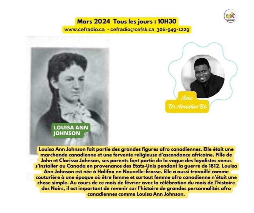 Louisa Ann Johnson fait partie des grandes figures afro canadiennes. Elle était une marchande canadienne et une fervente religieuse d'ascendance africaine. Fille de John et Clarissa Johnson, ses parents font partie de la vague des loyalistes venus s’installer au Canada en provenance des États-Unis pendant la guerre de 1812. Louisa Ann Johnson est née à Halifax en Nouvelle-Écosse. Elle a aussi travaillé comme couturière à une époque où être femme et surtout femme afro canadienne n’était une chose simple.