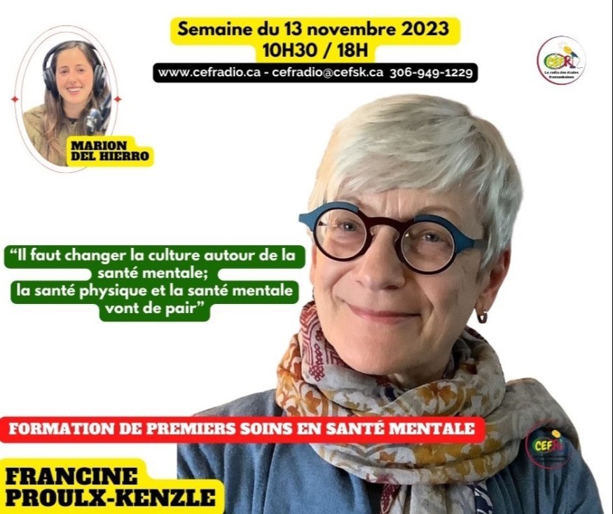 Cette fin de semaine du 18 novembre, Francine Proulx-Kenzle et Roger Gauthier animent une formation de premiers soins en santé mentale. Celle-ci aura lieu au collège Mathieu de Saskatoon.