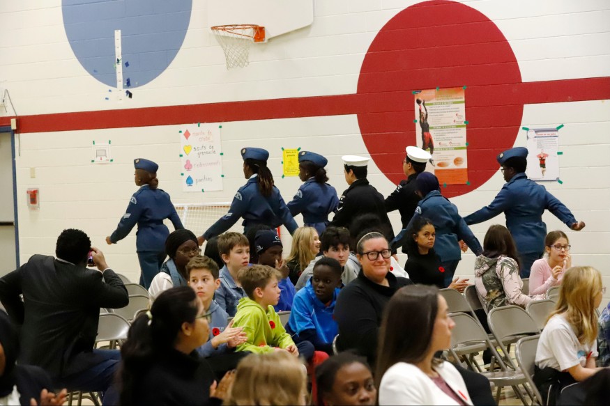 Erik Tremblay a discuté avec la directrice de l'école Sylvie Simo (première à gauche sur la photo) de l'importance de cet événement. Il a aussi interviewé Paula Apipila (quatrième sur la photo à partir de la gauche), une jeune cadette de l'air qui explique l'importance de cette commémoration pour les nouvelles générations.