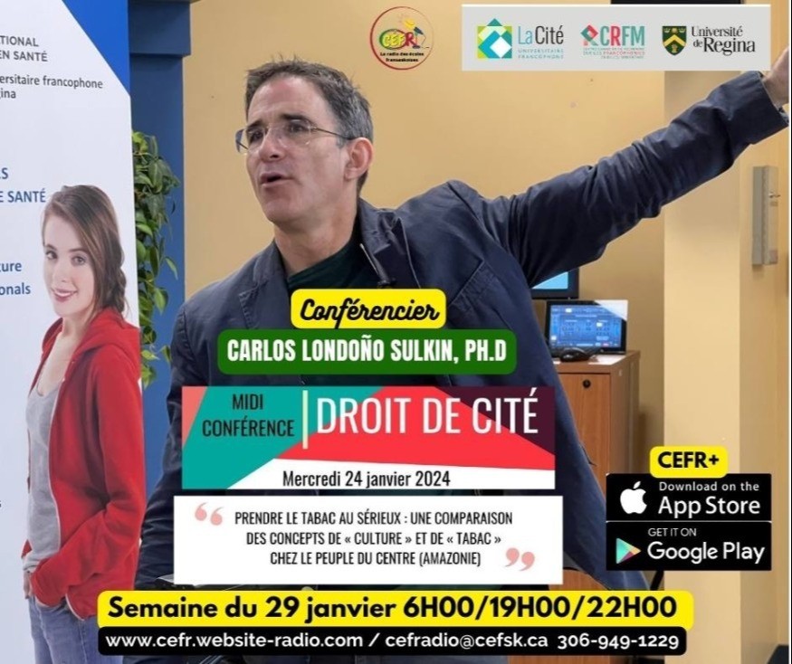 La série des midi-conférences Droit de Cité met en valeur les recherches des francophones et francophiles de la Saskatchewan.Pour la conférence du mercredi 24 janvier 2024, elle est animée par le Dr Carlos Londono Sulkin et à pour thème Prendre le tabac au sérieux : une comparaison des concepts de culture et de tabac chez le peuple du centre (Amazonie).