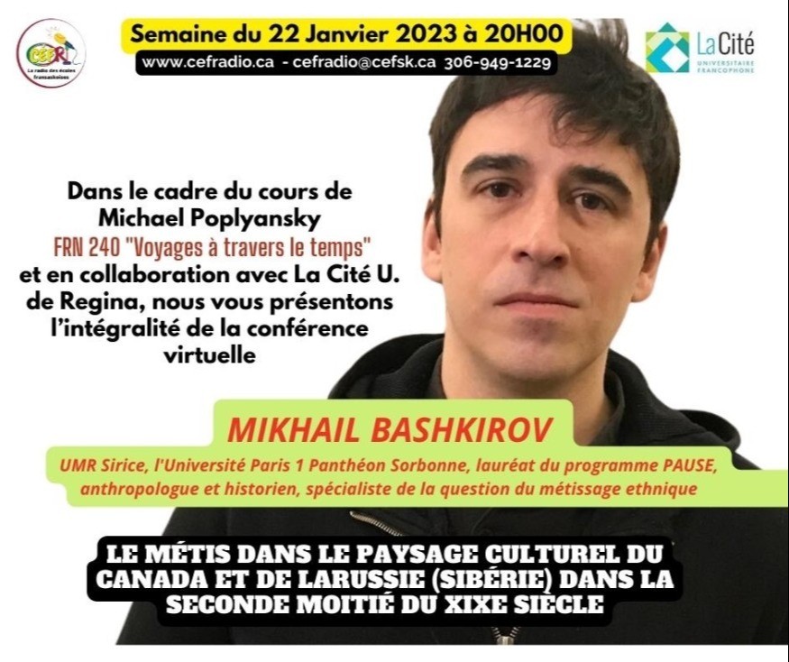 Dans le cadre du cours de Michael Poplyansky FRN 240 "Voyages à travers le temps" et en collaboration avec La Cité U. de Regina, nous vous présentons l’intégralité de la conférence virtuelle de MIKHAIL BASHKIROV. UMR Sirice, l'Université Paris 1 Panthéon Sorbonne, lauréat du programme PAUSE, anthropologue et historien, spécialiste de la question du métissage ethnique. Le thème de sa conférence : Le Métis dans le paysage culturel du Canada et de la Russie (Sibérie) dans la seconde moitié du XIXe siècle.