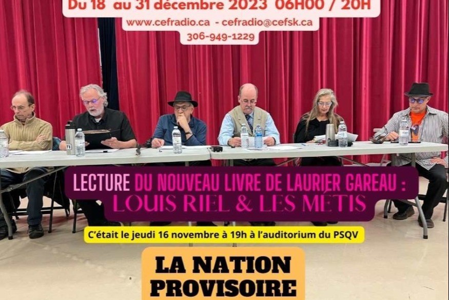 Le jeudi 16 novembre 2023 a eu lieu la lecture du nouveau roman de Laurier Gareau, La nation provisoire" La soirée à eu lieu dans l'auditorium du PSQV et la lecture a été faite en français, Mitchif-français et en Anglais. Théme : Louis Riel et les Métis.